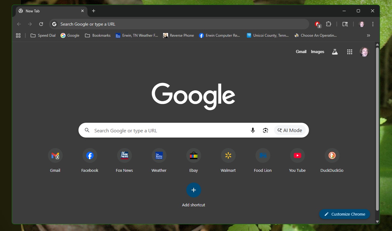 I put in 2 custom "Erwin" themes. Custom local background, colors and such. By default I use a DARK theme. Popular now, as the dark theme often makes it easier to read stuff. Simple to switch around.